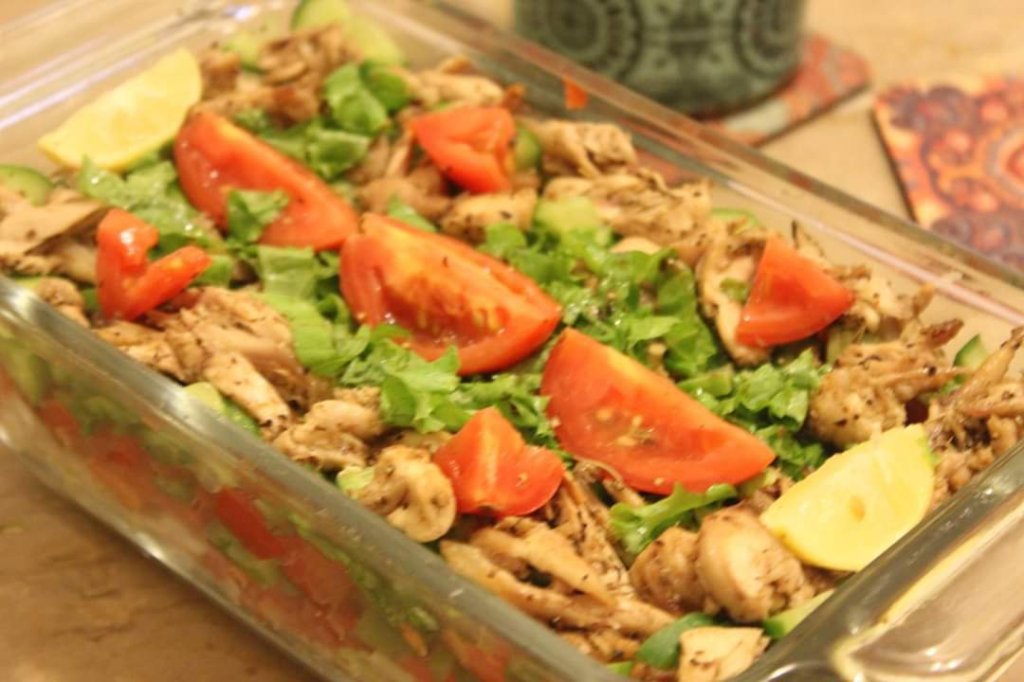 Layers of green leaf lettuce, peppers, corn, tomatoes, onions, cheddar cheese, roast chicken All dressed in a creamy homemade salad dressing.