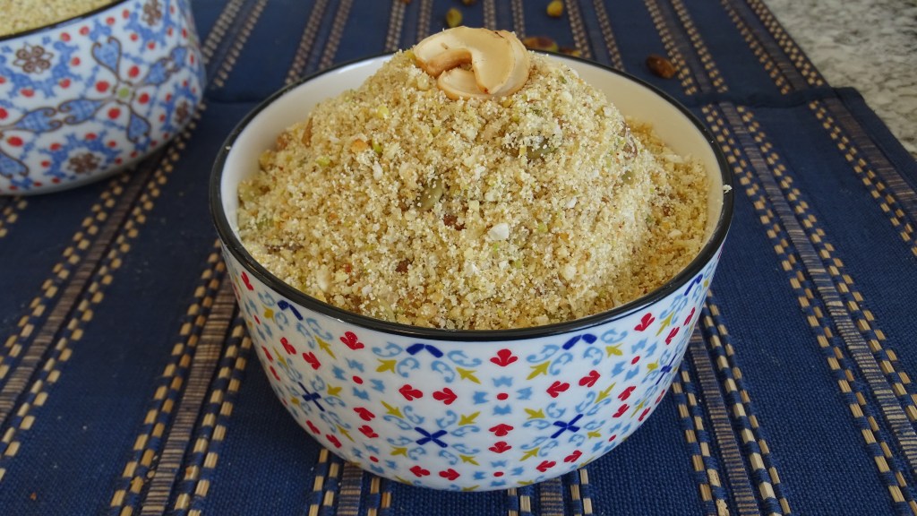 Sauté all the ingredients separately in ghee expect semolina and sugar,