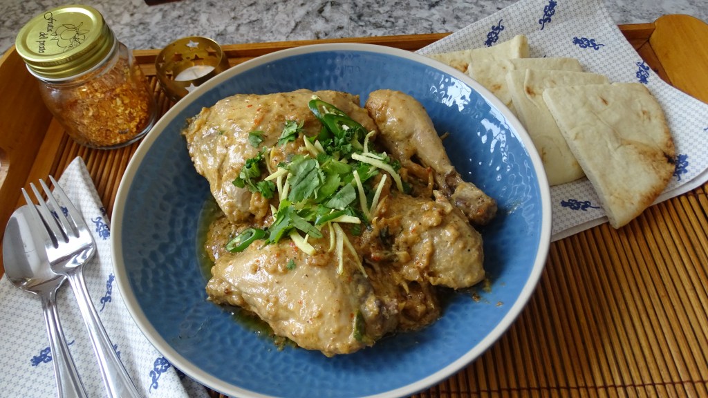 Add yogurt, ½ cup water, ½ of the ginger with other spices, cook till chicken is tender,