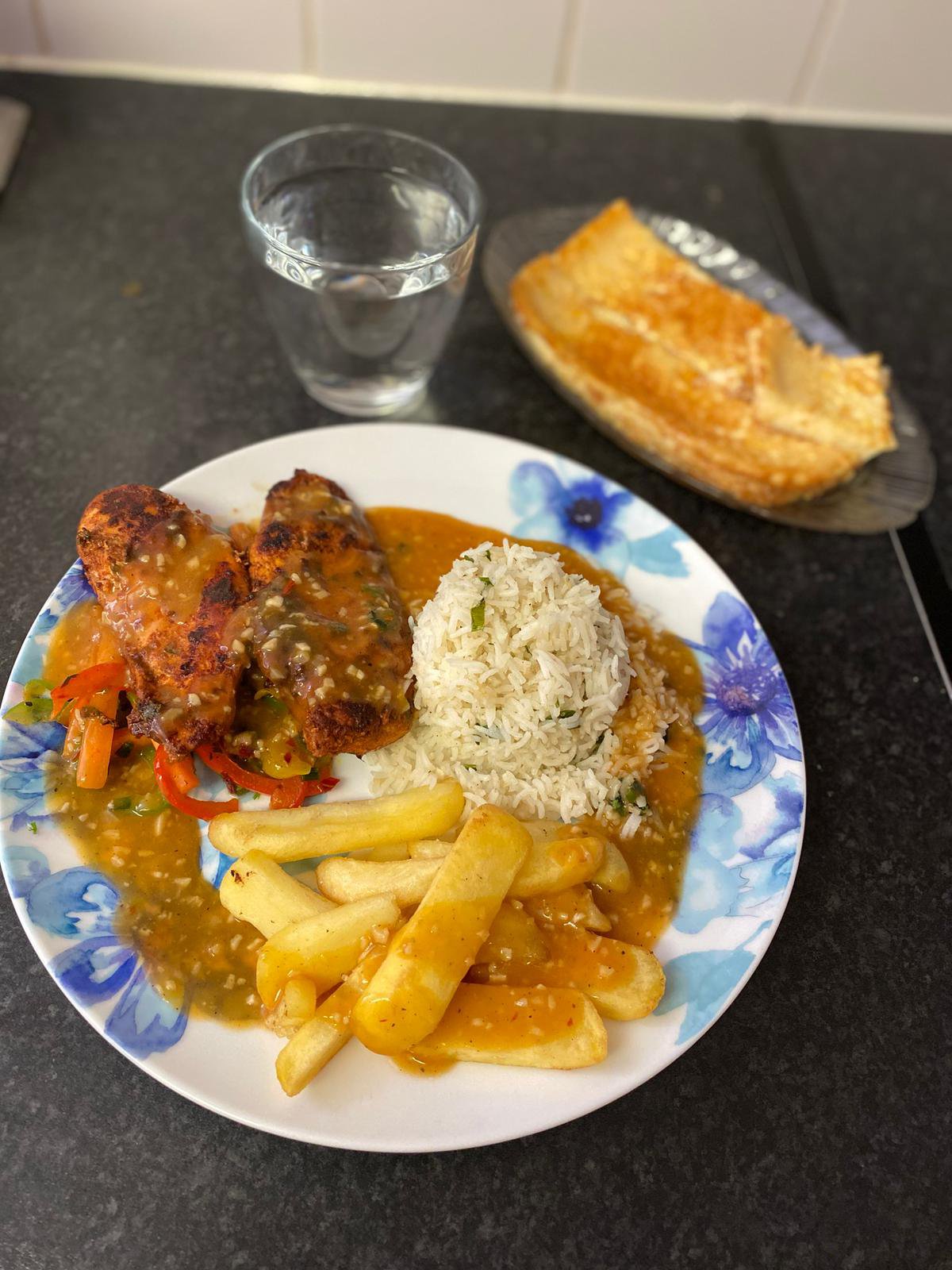 Serve with chips on a bed of veg and garlic rice