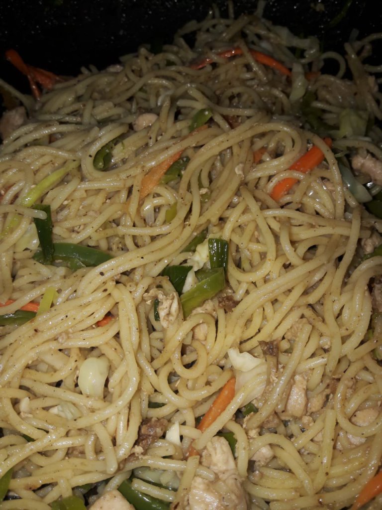 Fry 3cloves of chopped garlic in 1/2 cup oil then add the chicken… Cook till it changes colour… Add in julienne cut capsicum carrot.. Cabbage… Spring onion.