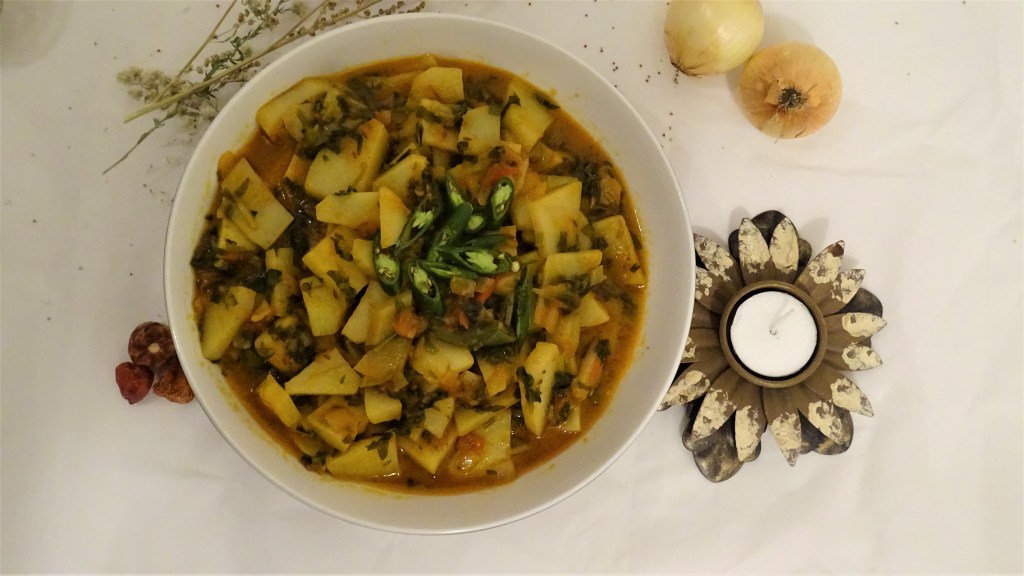 Now add potatoes, fenugreek leaves and green chilies,