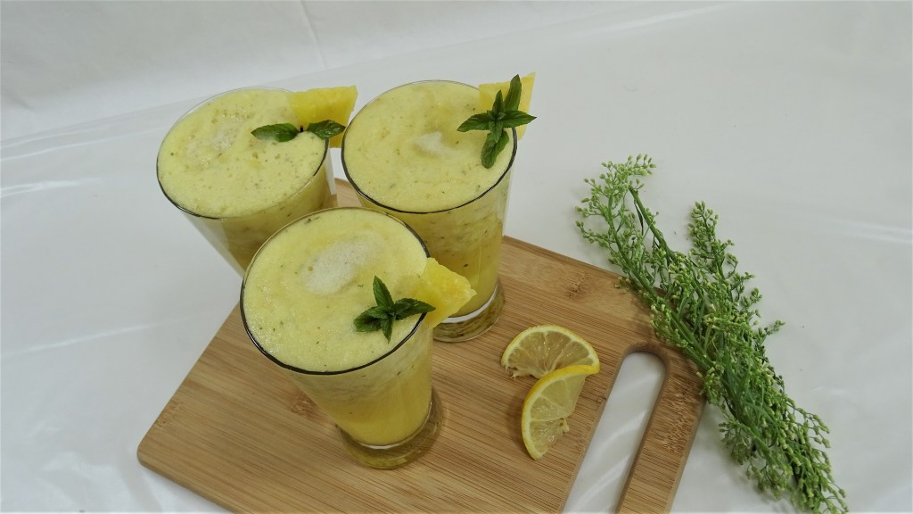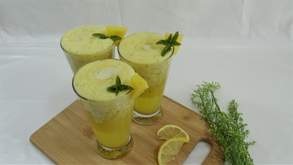 Beverages, Drinks Pineapple lemonade | summer refreshing drink | Areeba’s kitchen Posted by Areeba Azam on August 28, 2021 Pineapple chunks 3 cups Soda water 355 ml or 1 tin Ginger 4 small pieces Mint 8-10 leaves Lemon 1 large salt ½ teaspoon put everything in a blender, and blend till every thing mixes well serve cold and enjoy Share this: Share on X (Opens in new window) X Share on Facebook (Opens in new window) Facebook Like Loading... Related Published by Areeba Azam Born to help people. View all posts by Areeba Azam