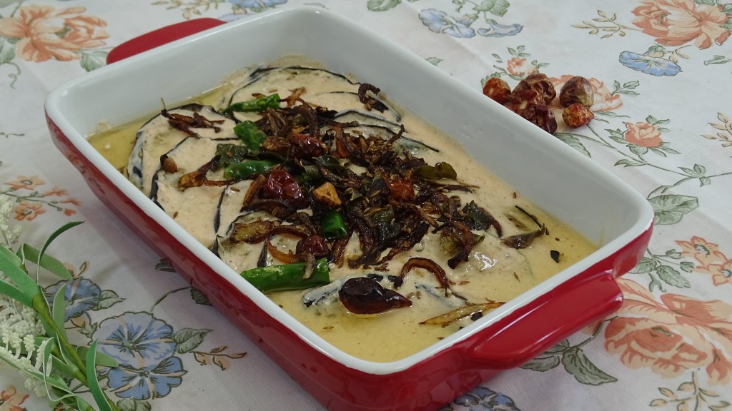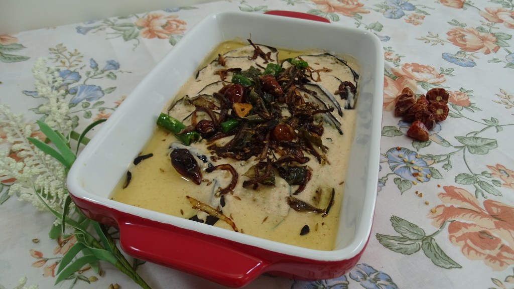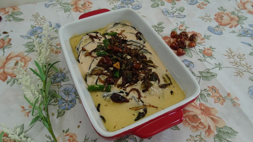 now pour the yogurt mixture on top of a serving dish containing egg-plant