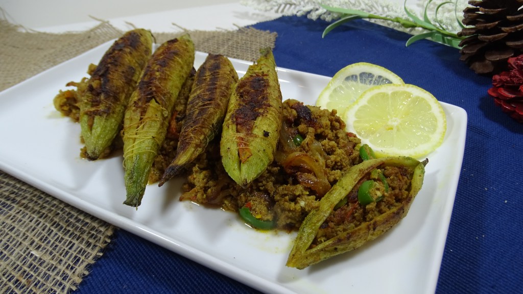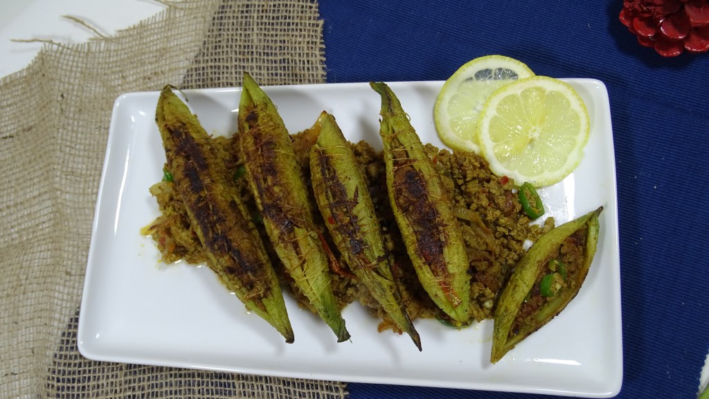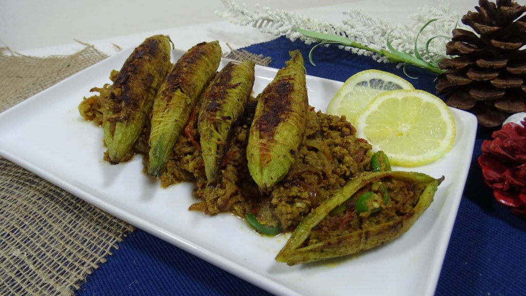 Fill the prepared karelay with qeema and tie it with thread