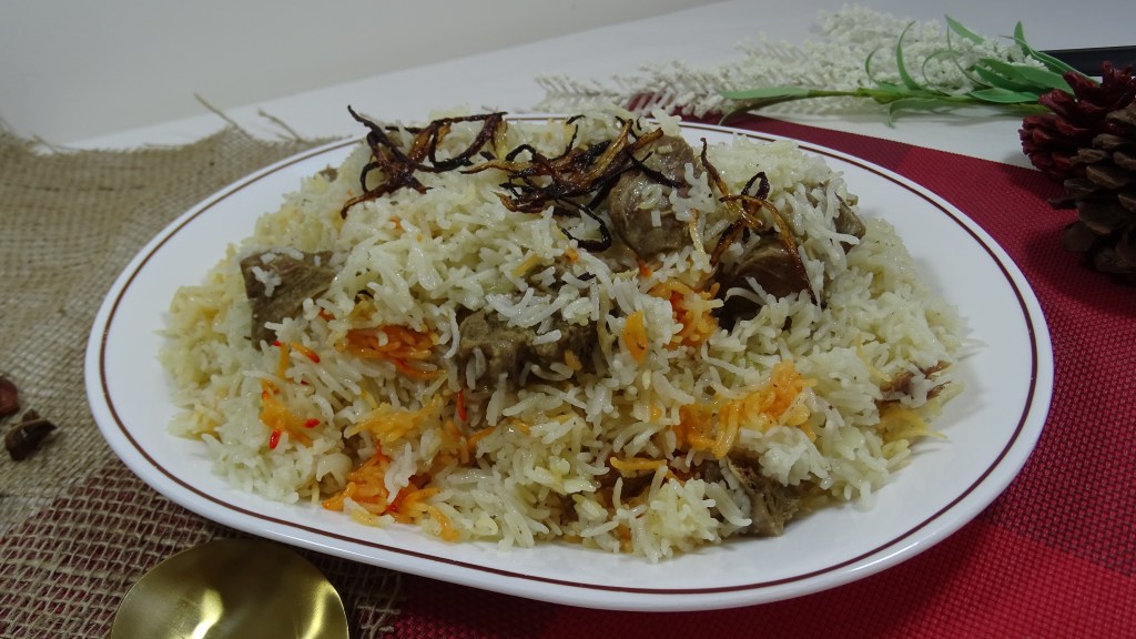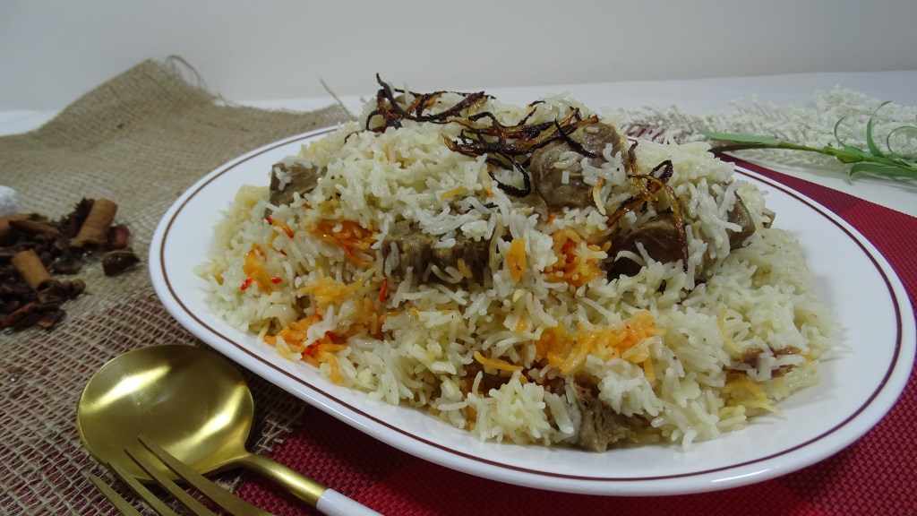 serve garama garam pulao with shami kabab, salad and raita