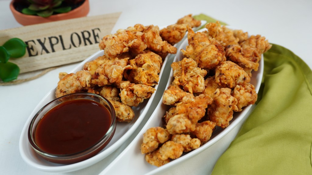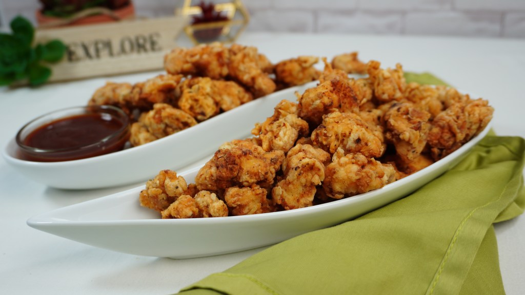 Take few chunks of marinated chicken and place it in a flour mixture, mix well,