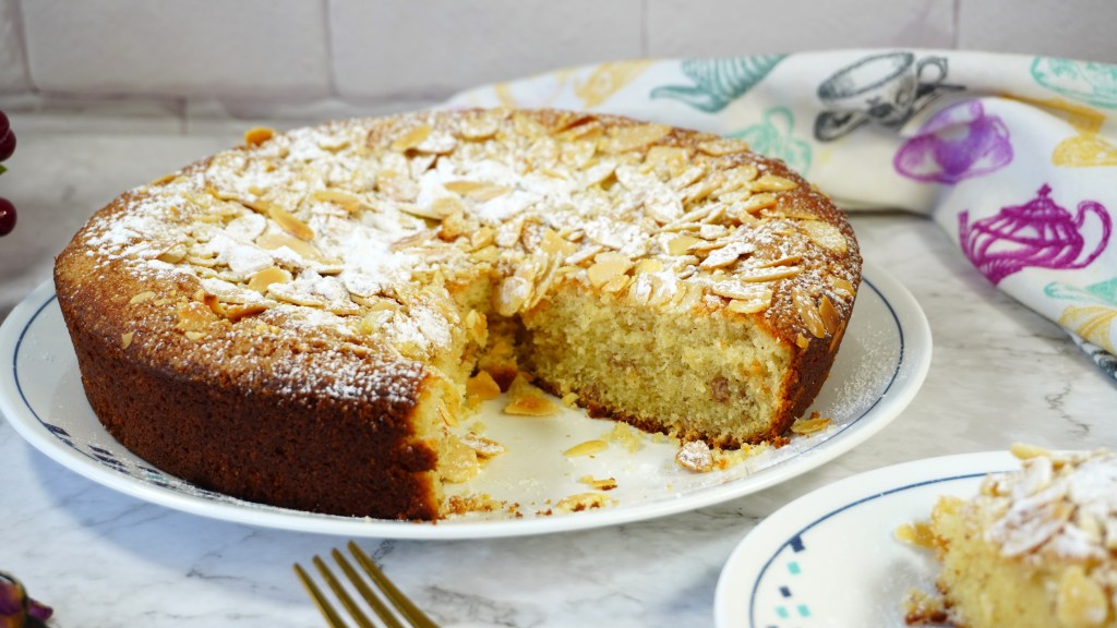 Sprinkle some sugar and sliced almonds.